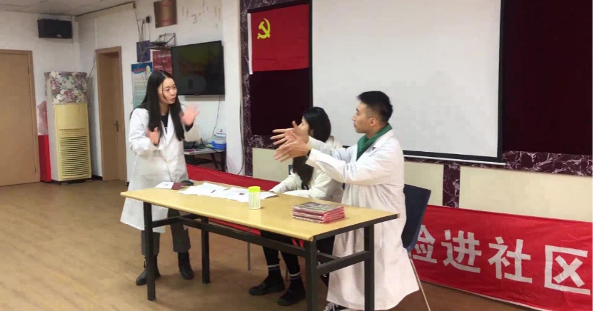 图3:“假神医真体检,真骗子卖假药”小品剧照,支部党员以小品的形式生动再现保健品诈骗套路