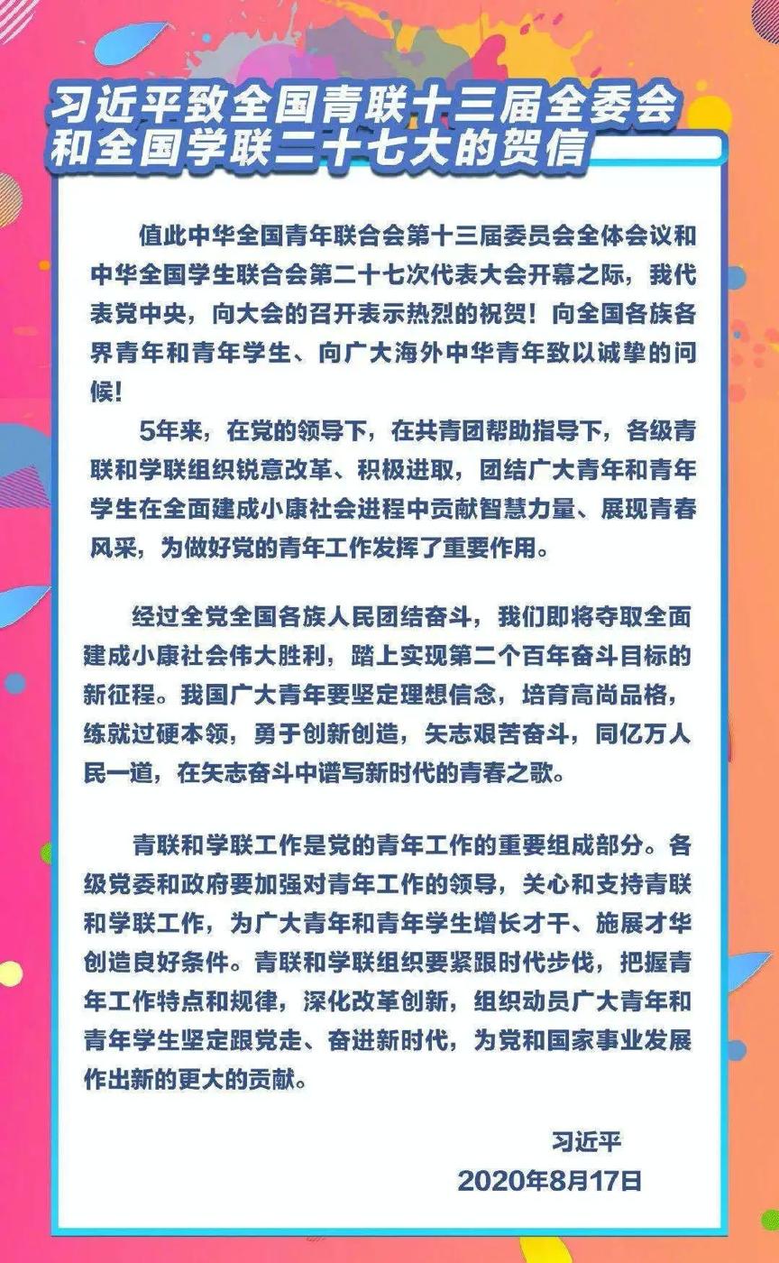 中华全国青年联合会第十三届委员会全体会议、中华全国员工联合会第二十七次代表大会8月17日上午在京开幕。中共中央总书记、国家主席、中央军委主席习近平发来贺信,代表党中央,向大会的召开表示热烈的祝贺,向全国各族各界青年和青年员工、向广大海外中华青年致以诚挚的问候。