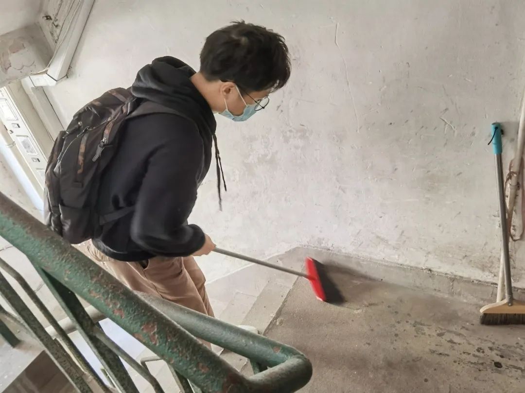 党员志愿者们从社区居委会工作人员那里了解到,小区里很多居民楼中住的都是老人,他们行动不便,对楼道里的卫生难免有些力不从心,因此小区里很多居民楼的楼道里、扶手上都沾满了灰尘。于是,志愿者们两或三人组成一组,负责两到三栋居民楼里楼道的清洁工作。
