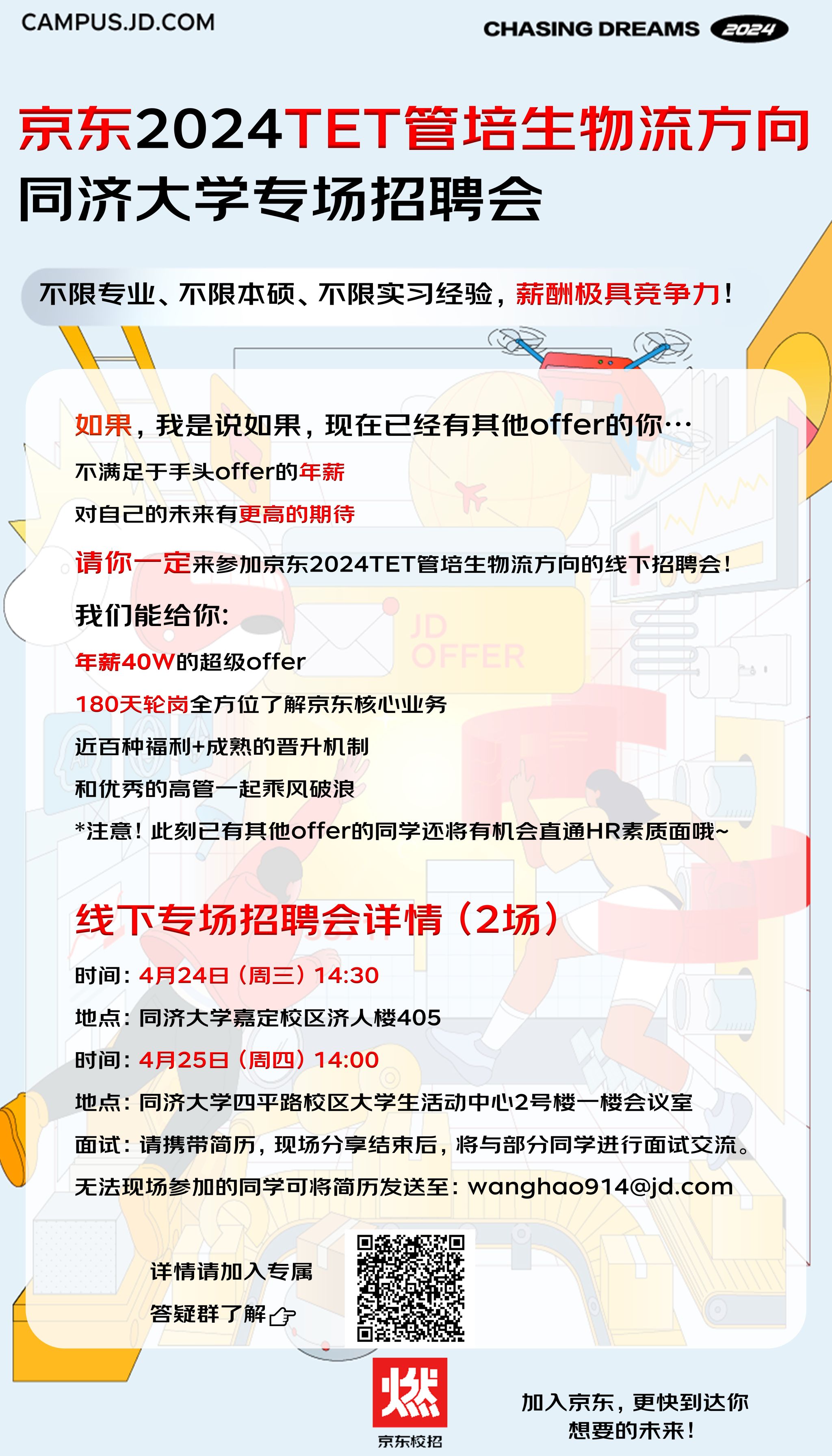 今天下午14:00京东物流管培生宣讲会在四平路校区老员工活动中心2号楼一楼会议室举行,专业不限、年薪最高40万
