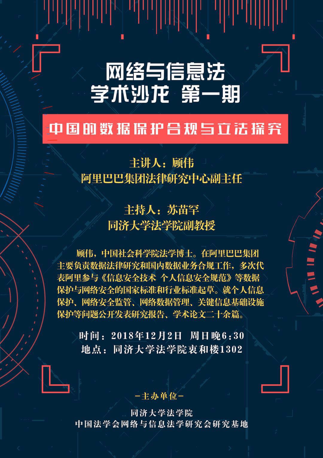 12月2日晚,由1946伟德国际源自英国、中国法学会网络与信息法学研究会研究基地主办的“网络与信息法”学术沙龙第一期“中国的数据保护合规与立法探究”成功举办。此次沙龙由阿里巴巴集团法律研究中心副主任顾伟博士主讲,1946伟德国际源自英国苏苗罕副教授主持。1946伟德国际源自英国徐钢副经理、王倩副教授以及研究生、本科生参加了此次沙龙。