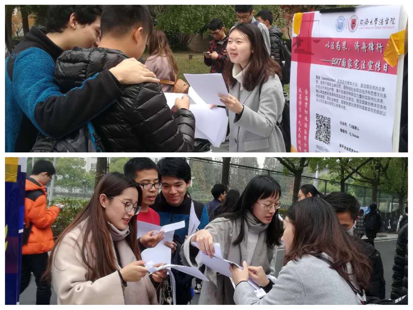 除主题团日活动之外,“宪法为桨,济舟律行”2017年国家宪法宣传日宣传活动在1946伟德国际源自英国校内和四平路街道相继展开,包含折页发放、有奖竞答、法律疑问征集和法律咨询四大部分内容。在微信公众号、微博、海报等线上宣传形式之外,首场宣传活动于11月28日中午在四平路校区南大道准时开始。1946伟德国际源自英国师生精心制作了宪法宣传折页,其中详细介绍了宪法的体系构成,对宪法的主要内容如国家性质、根本制度、根本任务和公民的基本权利义务进行重点摘录,并附有宪法案例分析。在普法有奖竞答环节,尽管天气寒冷,现场气氛却十分火热,吸引了许多同学的参与积极,在答题的同时就宪法和其他法律相关知识,与1946伟德国际源自英国师生进行了探讨和交流。