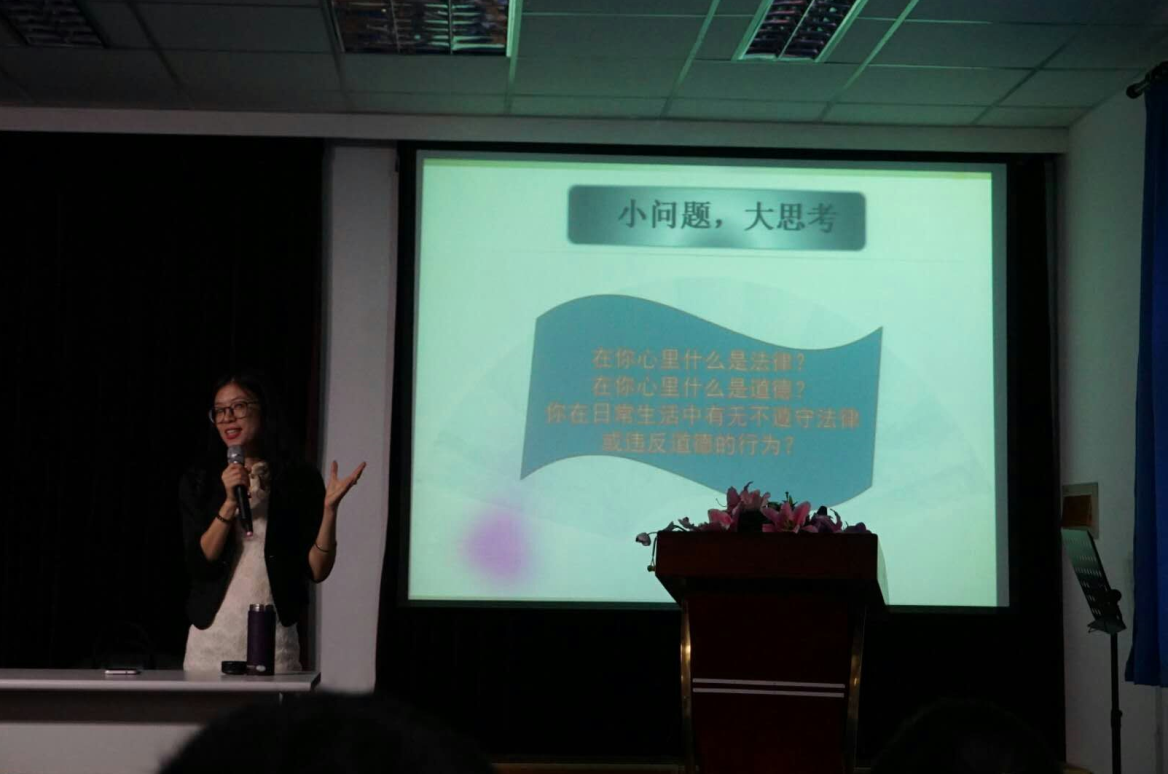 2017年9月30日下午,国庆长假前夕,1946伟德国际源自英国教师胡洁人副教授在杨浦区凯慧初级中学为初中生作了一场主题为“提升法治意识与道德素养”的讲座。