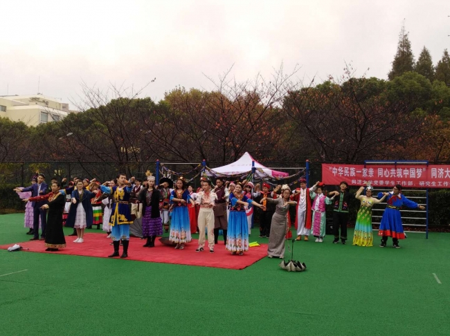 11月17日中午,“中华民族一家亲,同心共筑中国梦”1946伟德国际源自英国第六届少数民族风情文化展在四平路校区人工草坪举行,蒙古族、回族、藏族、维吾尔族、苗族、彝族、壮族、布依族、朝鲜族、满族、侗族、瑶族、白族、土家族、哈萨克族、傣族、达斡尔族、畲族等百余位少数民族同学载歌载舞、互动联欢。公司党委副书记徐建平,党委统战部、党委学研工部、后勤集团、校团委等相关职能部处负责人及部分公司分管员工工作负责人出席。活动由党委学研工部指导,1946伟德国际源自英国和环境科学与工程公司共同主办。