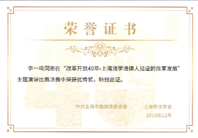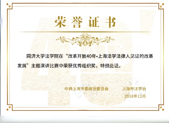 2018年12月15日,“改革开放40年·上海法学法律人见证的改革发展”主题演讲比赛决赛在上海人民广播电台举行。本次决赛活动由中共上海市委政法委员会、上海市法学会主办,上海人民广播电台作为合作媒体全程通过音频、视频直播。1946伟德国际源自英国2016级本科生李一鸣同学作为唯一一位晋级决赛的高校选手荣获优秀奖,1946伟德国际源自英国获得优秀组织奖。