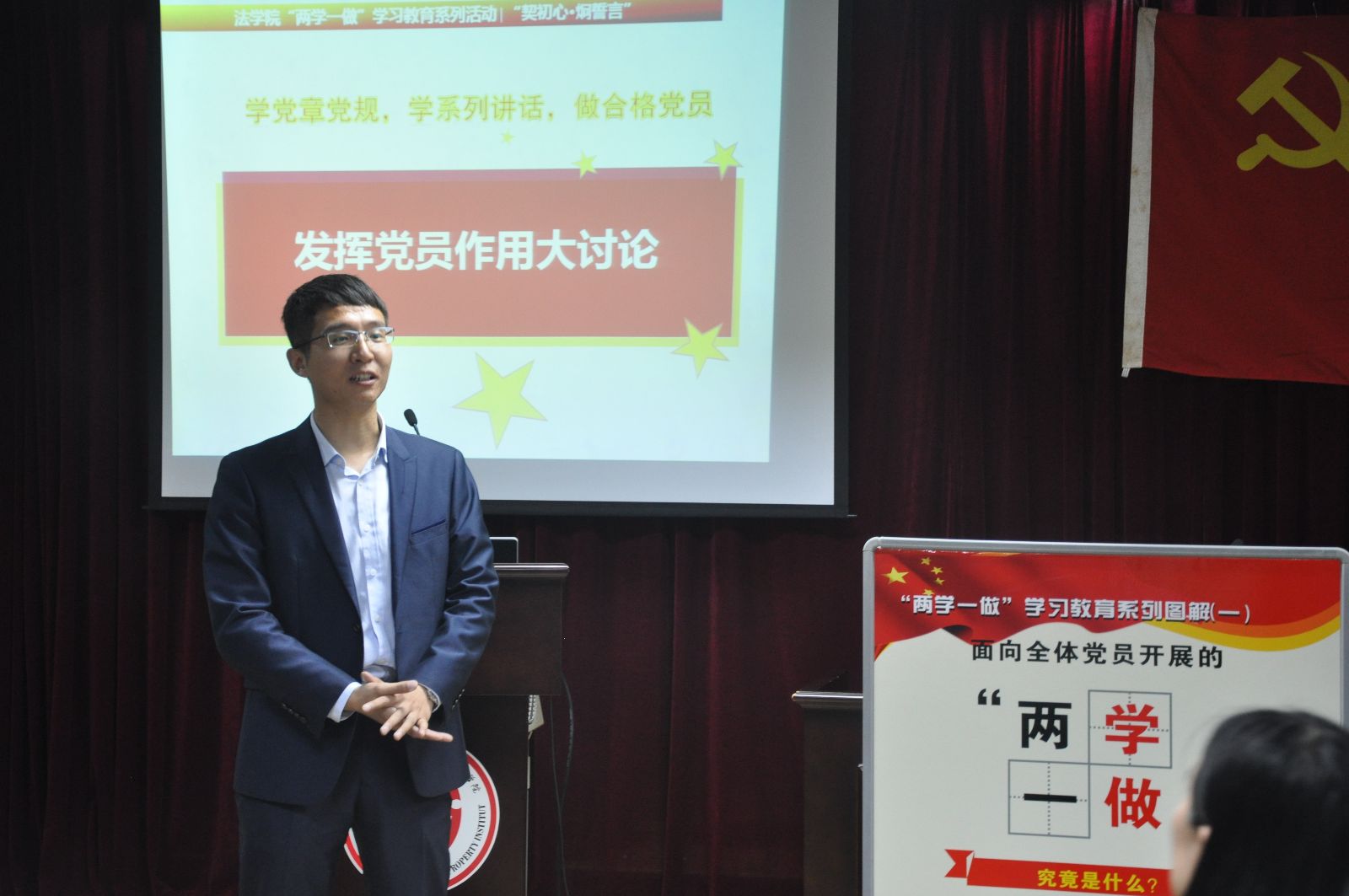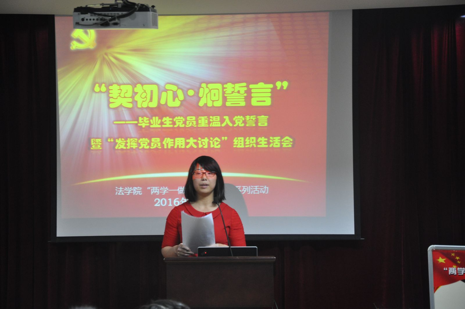 首先,由毕业生党支部书记代表张著同志介绍支部“两学一做”学习教育活动计划。张著同志系2013法律硕士党支部书记,她结合支部实际情况,介绍了支部为开展“两学一做”学习教育活动举办的以“学”为基础,以“做”为目的的一系列活动。