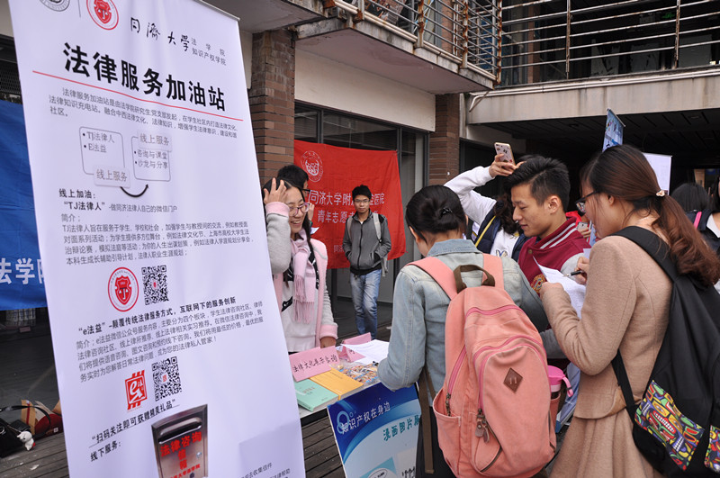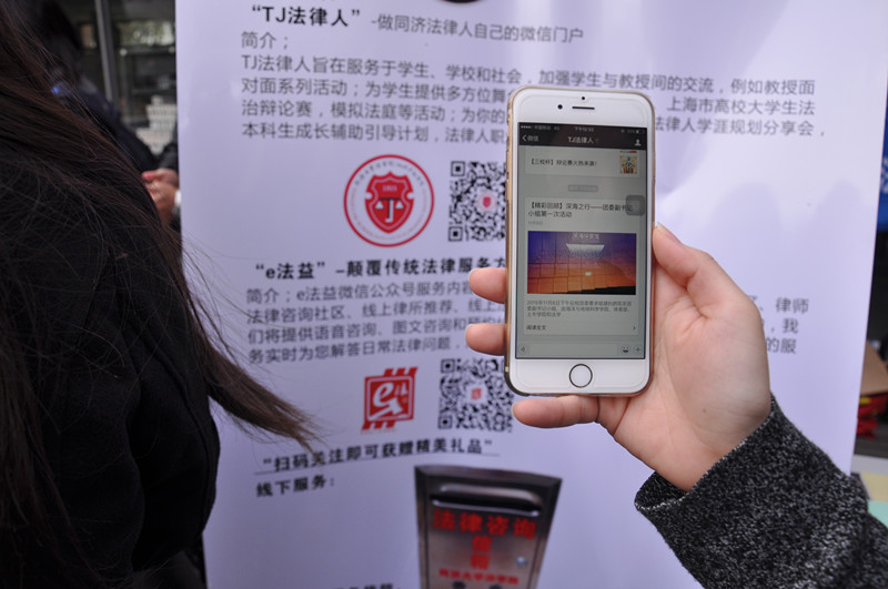 该项目在现场推出两个微信公众号,提供线上加油服务。由“tj法律人”微信公众号每日推送一篇法律知识文章,“e法益”微信公众号开展线上咨询服务。出席开幕式的师生对我们颠覆传统法律服务模式,进行互联网创新服务的做法表示肯定给予大力支持,并踊跃参与扫描“TJ法律人”、“e法益”微信公众号。