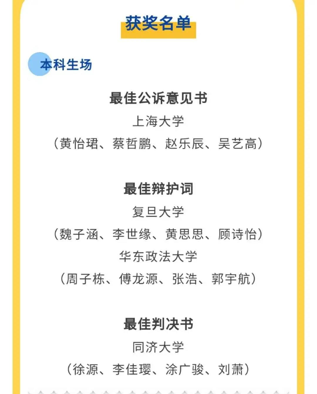 本科生场代表队由刘箫担任领队兼书记员,徐源担任审判长,李佳璎、涂广骏担任审判员,王慧睿、李泽熙、张倩倩、刘奕伶参与备赛。根据比赛规则,本科生代表队经抽签分至审判组,与公诉组华东师范大学代表队及辩护组复旦大学代表队,于第四场比赛就大赛组委会所提供的刑事案例进行模拟庭审对抗。