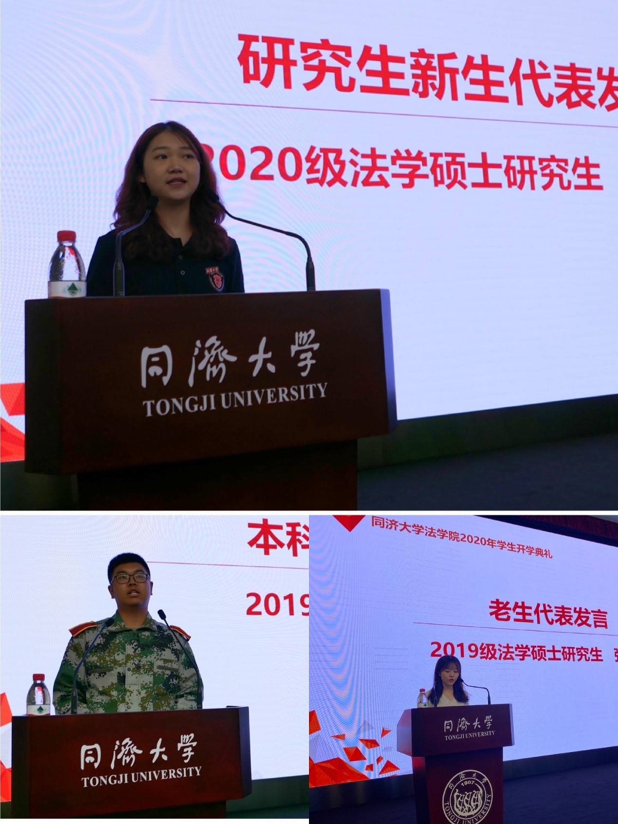 2019级法学硕士研究生张钟月作为老生代表发言。她首先感谢公司和公司为法律学子创造的良好学习、实践、交流的平台,并寄语学弟学妹们要:坚定理想信念,初心不改,使命不忘;锤炼各项本领,学无止境,勤于思考;积极投身实践,脚踏实地,仰望星空。陈宇佳、郭鑫祥,分别作为2020级研究生新生代表、2019级本科生代表发言,他们表达了作为一名新的“同济法律人”的欣喜和激动之情,并对即将开始的新的学习旅程表示期待与憧憬。