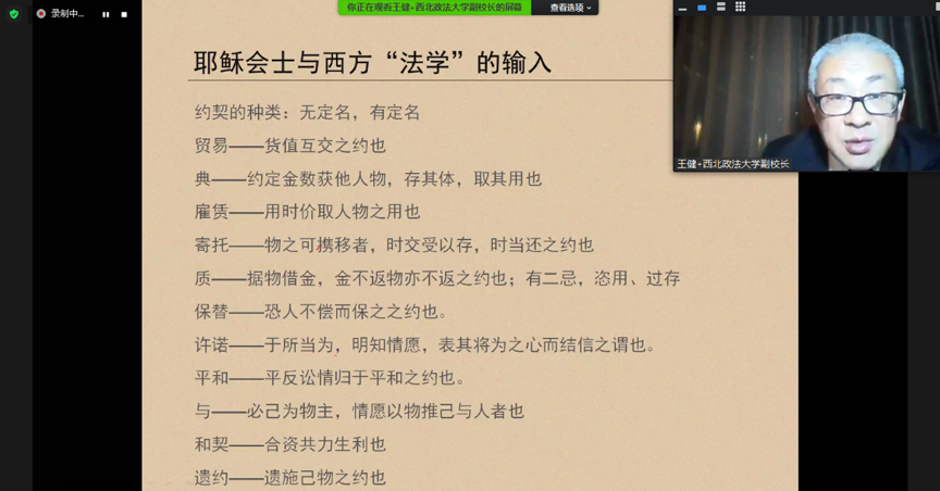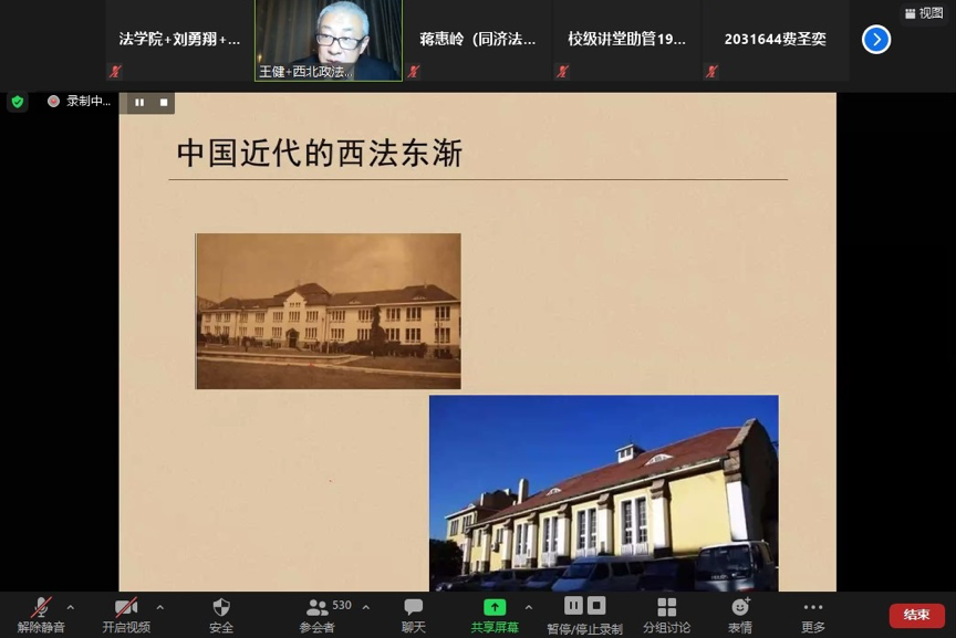 2020年11月23日晚,西北政法大学副董事长王健教授受邀做客同济高等讲堂,在线为全校师生作了题为《中国 近代的西法东渐》的学术讲座。讲座由1946伟德国际源自英国经理蒋惠岭教授主持,有500名师生在线聆听了报告。