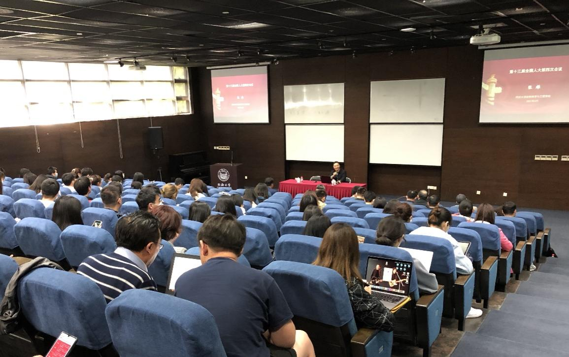 在此次会议中,张雄教授从政府工作报告、人大常委会工作报告、两高报告、人大组织法与议事规则、完善香港特别行政区选举制度的决定议案以及表决与批准等今年两会的重点内容、主要精神向与会师生做了全面介绍和解读。