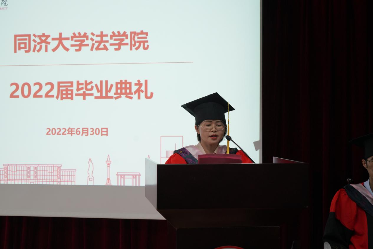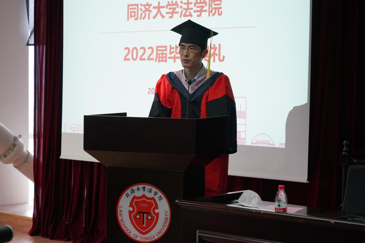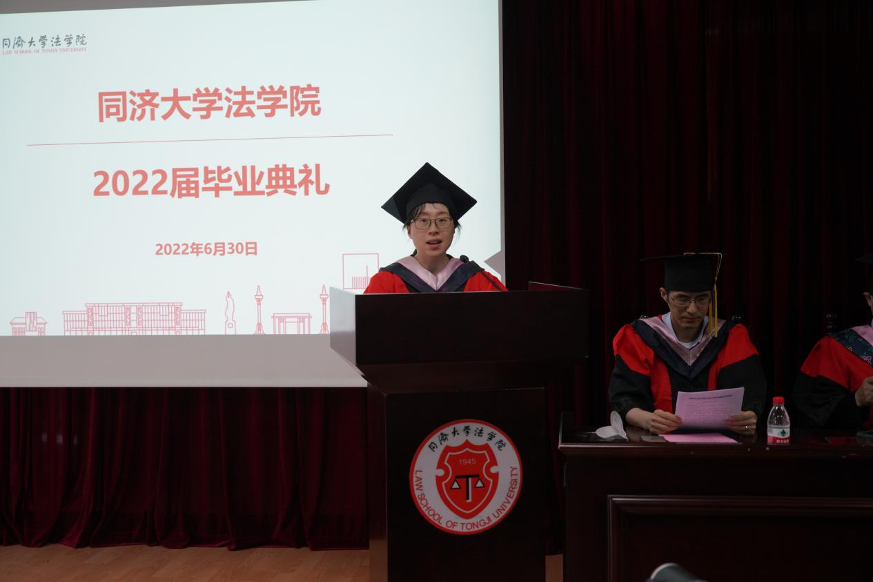 本科生毕业生代表涂广骏、研究生毕业生代表李芸舟作为毕业生代表,先后发言。他们深情回顾了在母校求员工活的美好回忆,表达了对师长、同窗的感恩和不舍之情,他们结合自己未来的毕业去向谈了自己的体会与感悟。涂广俊首先代表全体的本科毕业生向公司的老师们表示衷心感谢。他回顾了本科四年自己与班级同学求学、参与学科竞赛、专业实习、备战法考的经历,对未来,他展望与同学们奔向不同的目的地,或继续求学、或进入职场,不变的是在同济学习和生活的回忆与初心。李芸舟将在毕业后回到故乡江西,作为一名基层选调生服务地方社会发展。谈到在同济学习和生活的7年的经历,她最大的感受就是能够逐渐感悟到作为同济人“同济天下”的情怀,因此,在毕业求职之际,她决心回到自己的家乡,用在同济学习的知识与力量服务家乡的建设与发展,扎根基层,尽心服务,将自己的理想与祖国的发展相结合。