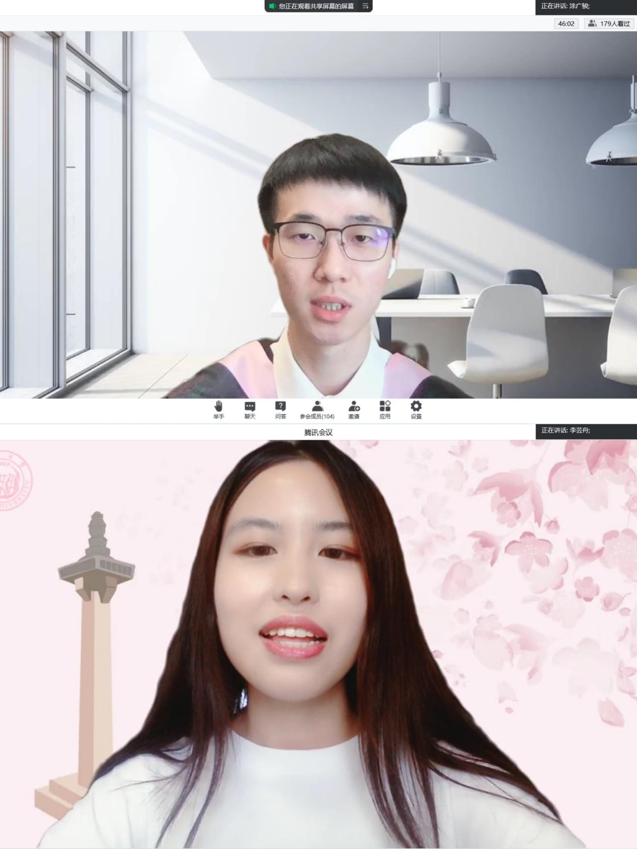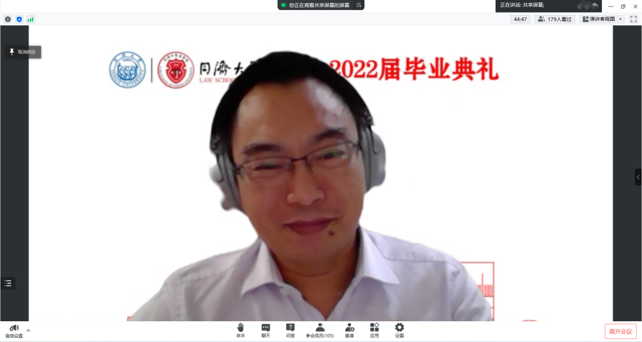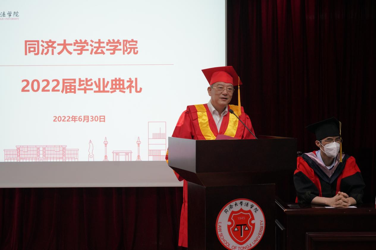 本科生毕业生代表涂广骏、研究生毕业生代表李芸舟作为毕业生代表,先后发言。他们深情回顾了在母校求员工活的美好回忆,表达了对师长、同窗的感恩和不舍之情,他们结合自己未来的毕业去向谈了自己的体会与感悟。涂广俊首先代表全体的本科毕业生向公司的老师们表示衷心感谢。他回顾了本科四年自己与班级同学求学、参与学科竞赛、专业实习、备战法考的经历,对未来,他展望与同学们奔向不同的目的地,或继续求学、或进入职场,不变的是在同济学习和生活的回忆与初心。李芸舟将在毕业后回到故乡江西,作为一名基层选调生服务地方社会发展。谈到在同济学习和生活的7年的经历,她最大的感受就是能够逐渐感悟到作为同济人“同济天下”的情怀,因此,在毕业求职之际,她决心回到自己的家乡,用在同济学习的知识与力量服务家乡的建设与发展,扎根基层,尽心服务,将自己的理想与祖国的发展相结合。