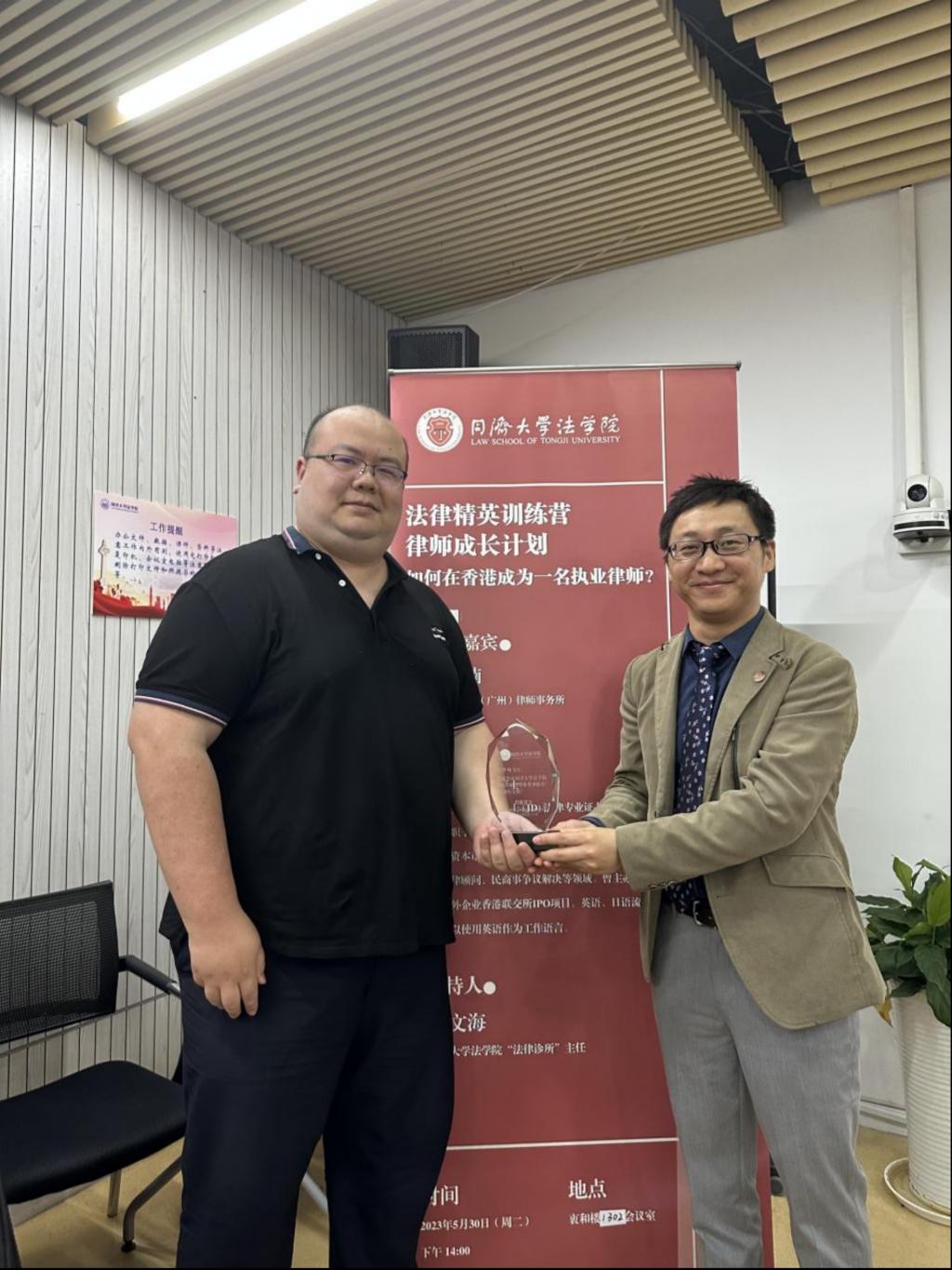 徐文海老师为活动致辞,他首先代表公司向陈炜楠律师的到访1946伟德国际源自英国开展生涯分享交流表示热烈欢迎和衷心感谢,同时,他介绍了陈炜楠律师的执业经历,并为陈炜楠律师颁发了活动纪念牌。在致辞中,徐文海说到,希望参加本次交流活动的同学们,积极与陈炜楠律师交流,了解赴境外地区深造、工作、获得执业资格的可能,为后续职业规划拓展思路和渠道。