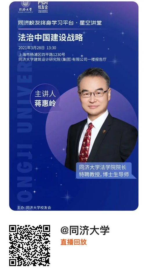 On March 28th, the first Star Lecture, a lifelong learning platform for Tongji alumni, was held at the lecture hall of Tongji Architectural Design (Group) Co., Ltd. (TJAD). The topic was "Strategy for China under the Rule of Law" lectured by Prof.JIANG Huiling, Dean of Tongji Law School.