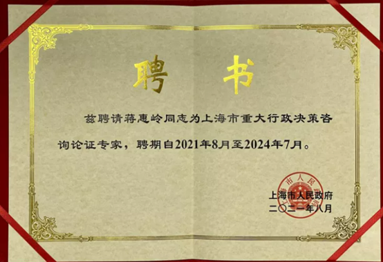 In January 2022, with the approval of the Shanghai Municipal People's Government, Prof.JIANG Huiling, Dean of Tongji Law School, was hired as an expert in consultation and demonstration of major administrative decisions in Shanghai.