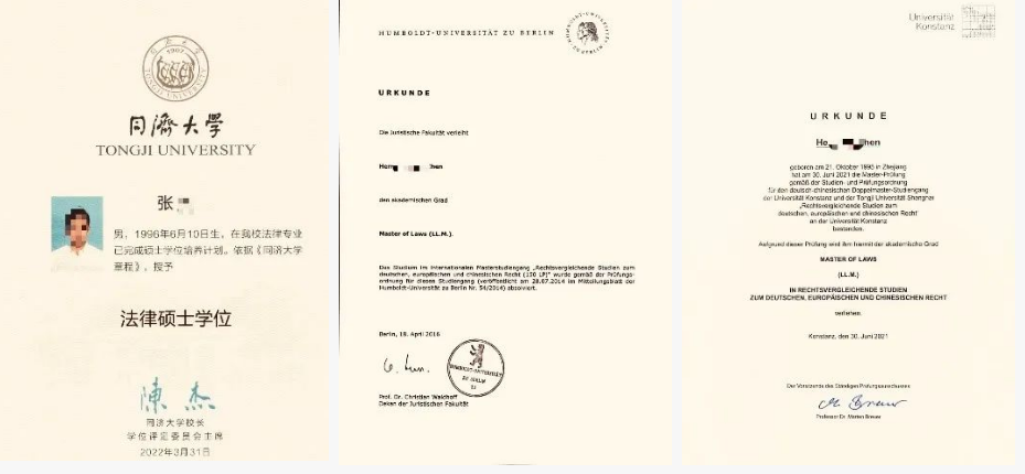 After successfully completing all the courses and defending the dissertation at Tongji University and the German partner university, students will receive two degree certificates, namely the degree of Master of Laws (LL.M.) from Tongji University and the degree of Master of Laws (LL.M.) from Humboldt University or Konstanz University in Germany.