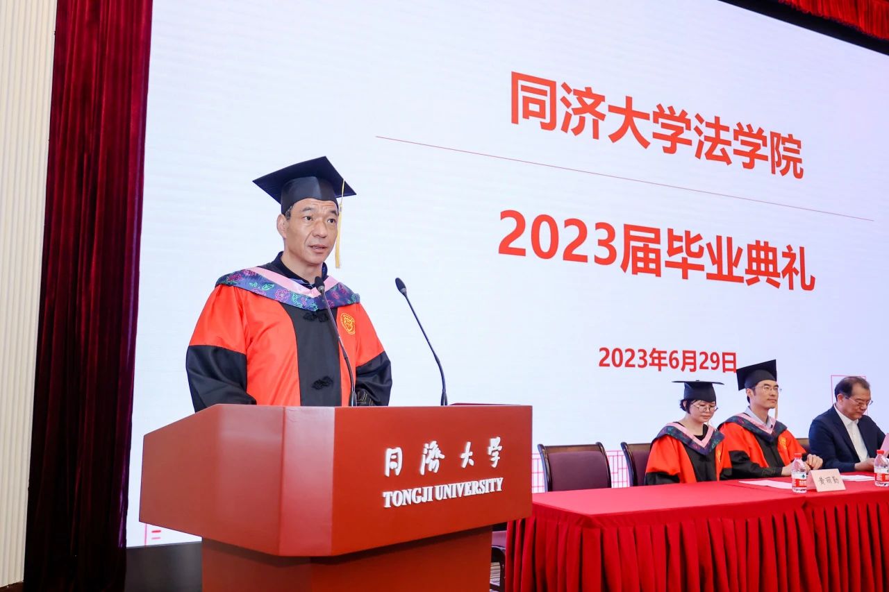On the morning of June 29, 2023, the 2023 Graduation Ceremony of the Law School of Tongji University was held in the Lecture Hall on the first floor of Yifu Building on Siping Road Campus. Lei Xinghui, member of the Standing Committee of the Party Committee and Vice President of Tongji University, Jiang Huiling, Dean of the Law School, Wu Weimin, Secretary of the Party Committee, Xu Gang and Huang Liqin, Vice Dean of the Law School, Liu Yang, Deputy Secretary of the Party Committee and Secretary of the Commission for Discipline Inspection, deans of the teaching and research departments, graduating class deans, faculty members' representatives and teachers from the School's Comprehensive Office, Office of Student Work and Office of Teaching and Learning, etc., were present in the ceremony to witness the graduation of 81 undergraduate graduates and 218 graduate students of the Class of 2023.