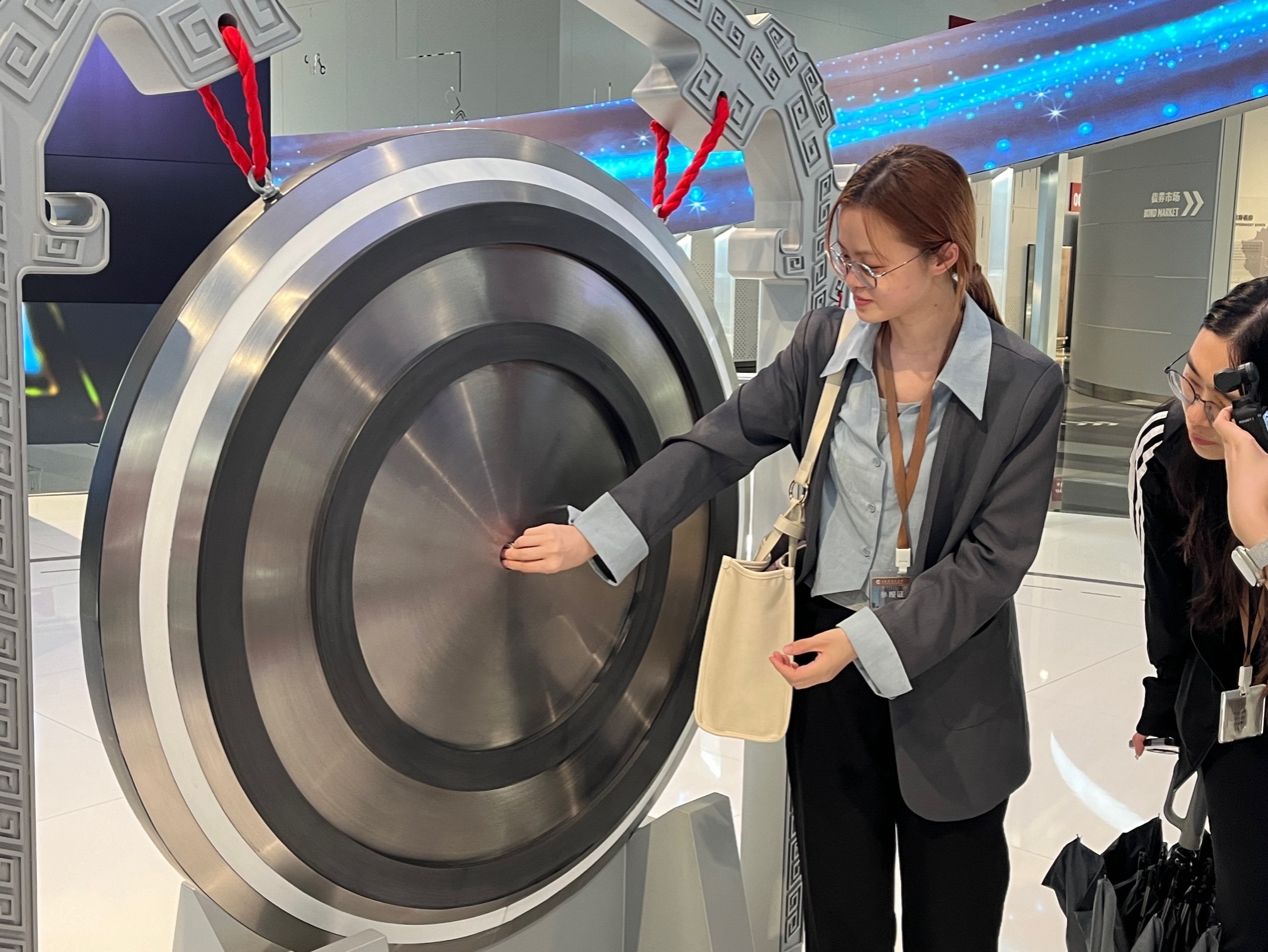 随后,同学们在工作人员指导下体验了上市仪式的“敲钟”环节。当钟声响起,象征着企业首发上市的重要时刻,趣味性的体验也为本次上交所沉浸式参访画上了充满仪式感的句号。