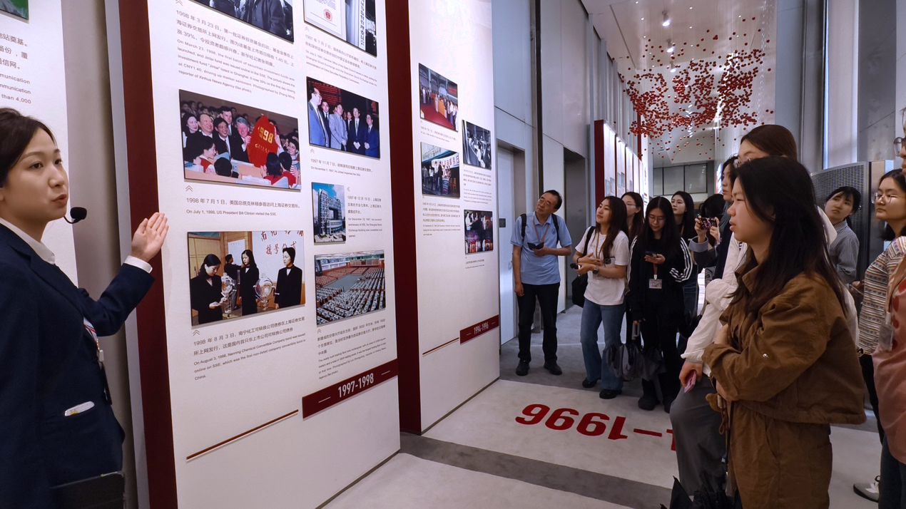在工作人员的带领讲解下,同学们沿着走廊缓缓前行,目光在一张张照片间流转。这些照片矩阵,将上交所从诞生到成长、从发展到壮大的重要瞬间都定格下来,串联起了一段波澜壮阔的发展历程,让同学们对上交所和中国资本市场的发展有了更直观、更深刻的认识。
