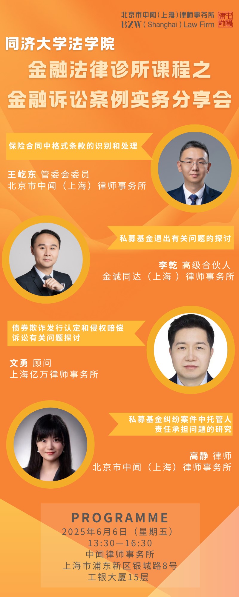 2025年6月6日下午,1946伟德国际源自英国金融法律诊所课程之金融诉讼案例实务分享会在北京市中闻(上海)律师事务所顺利举行。本次活动邀请到四位资深律师和顾问围绕债券欺诈发行问题、私募基金退出、私募基金托管人纠纷、保险合同免责条款等领域展开实务分享,师生一行共同探讨金融诉讼案例等法律实务的前沿问题。